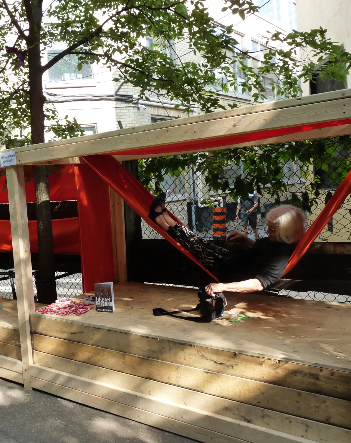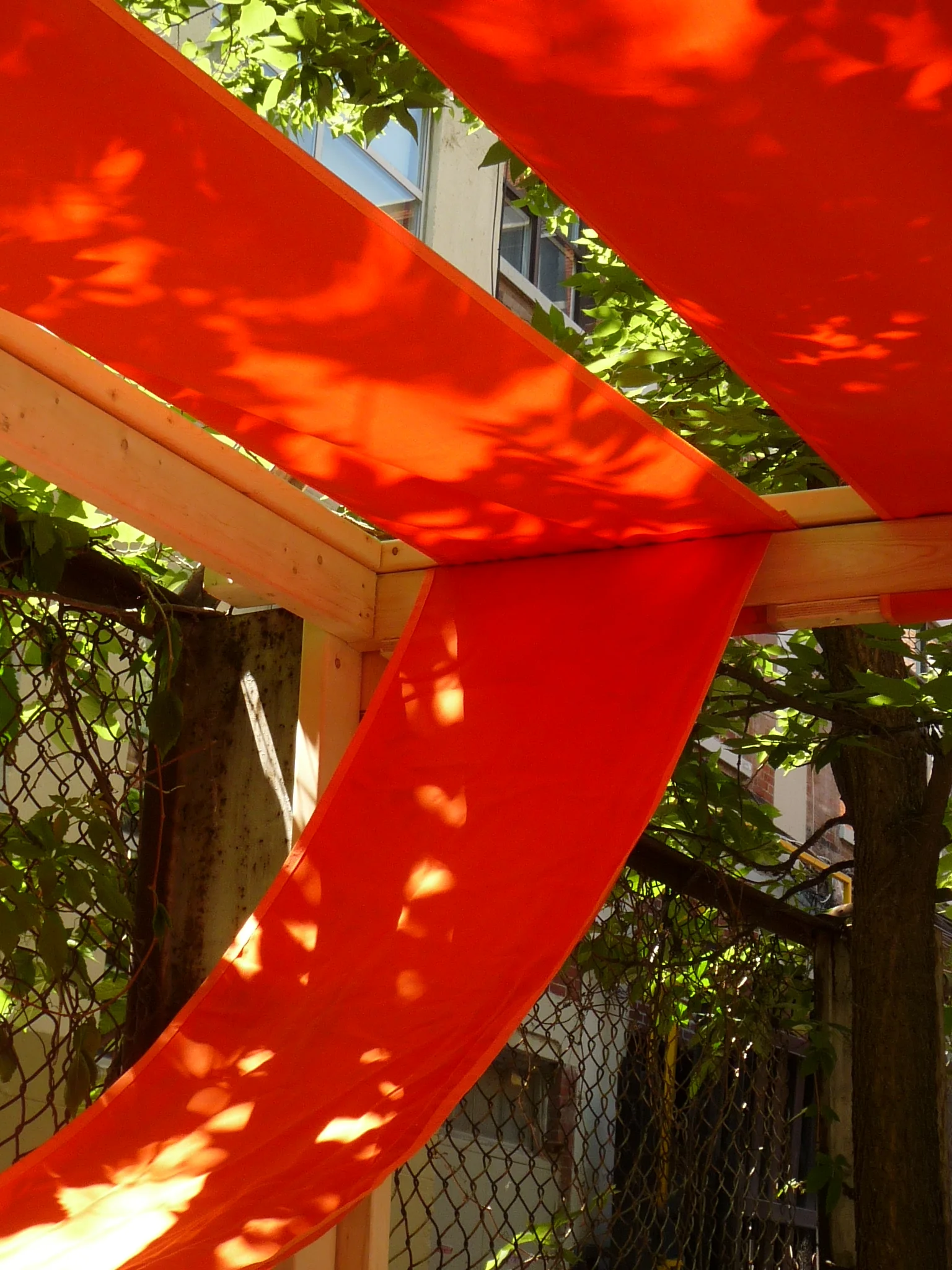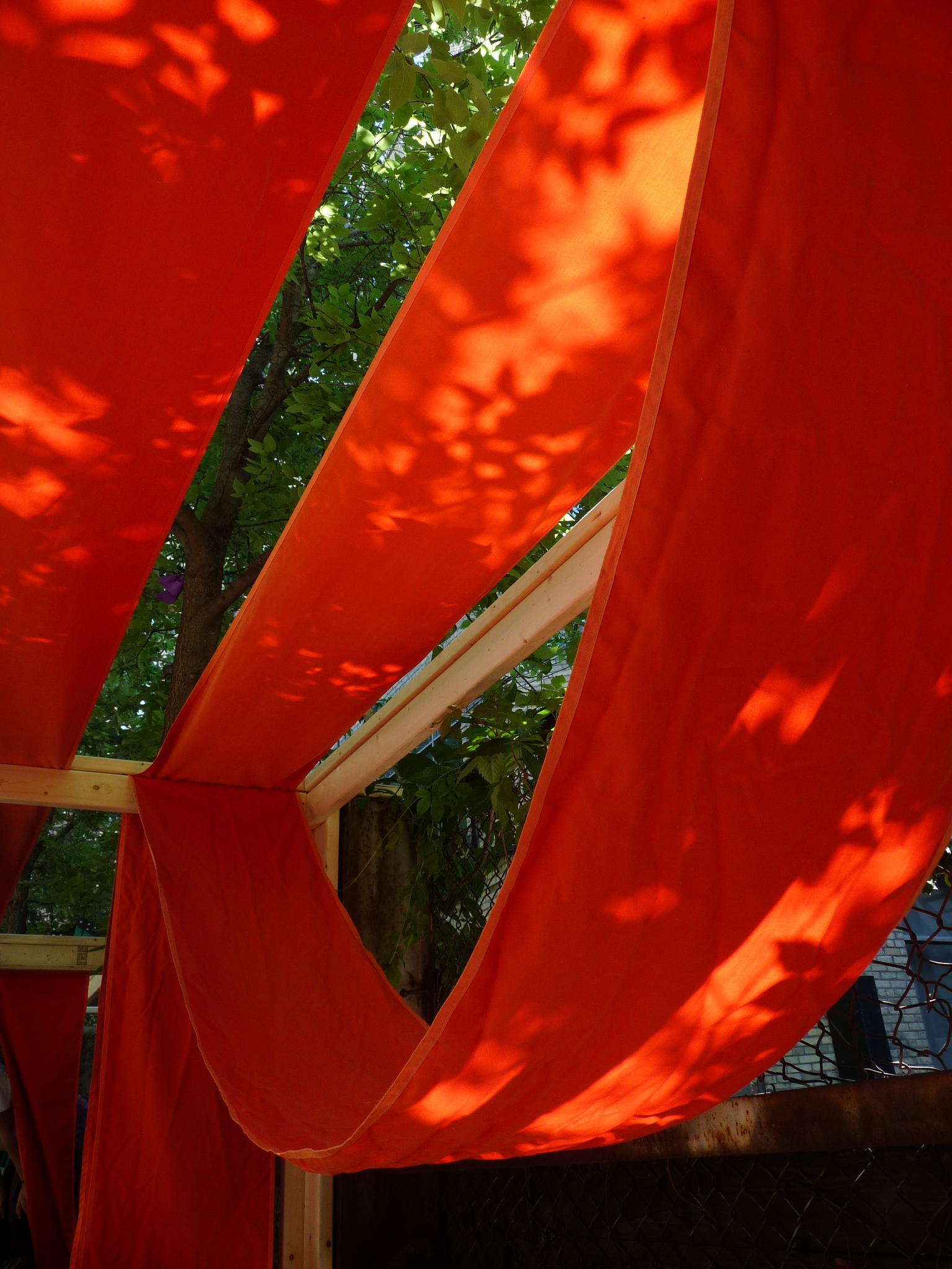 The installation uses found material – orange fabric and wood to embrace revitalization of a laneway public space.