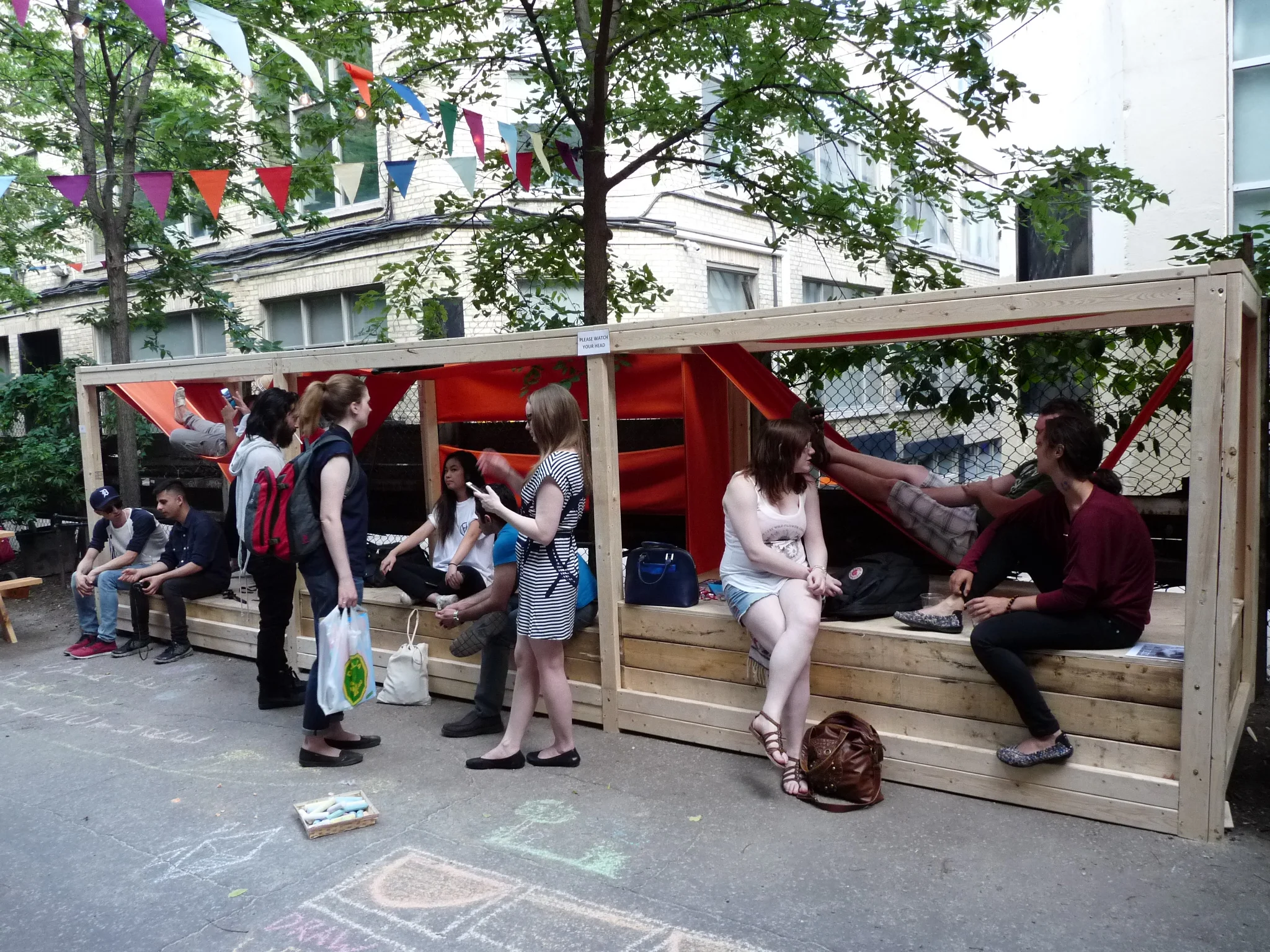 In order to activate social interaction both within the installation and among its users, the fabric is weaved through wooden scaffolding-like cubicles in a way that creates two levels of hammocks as well as canopy which subsequently creates an enclosed space.