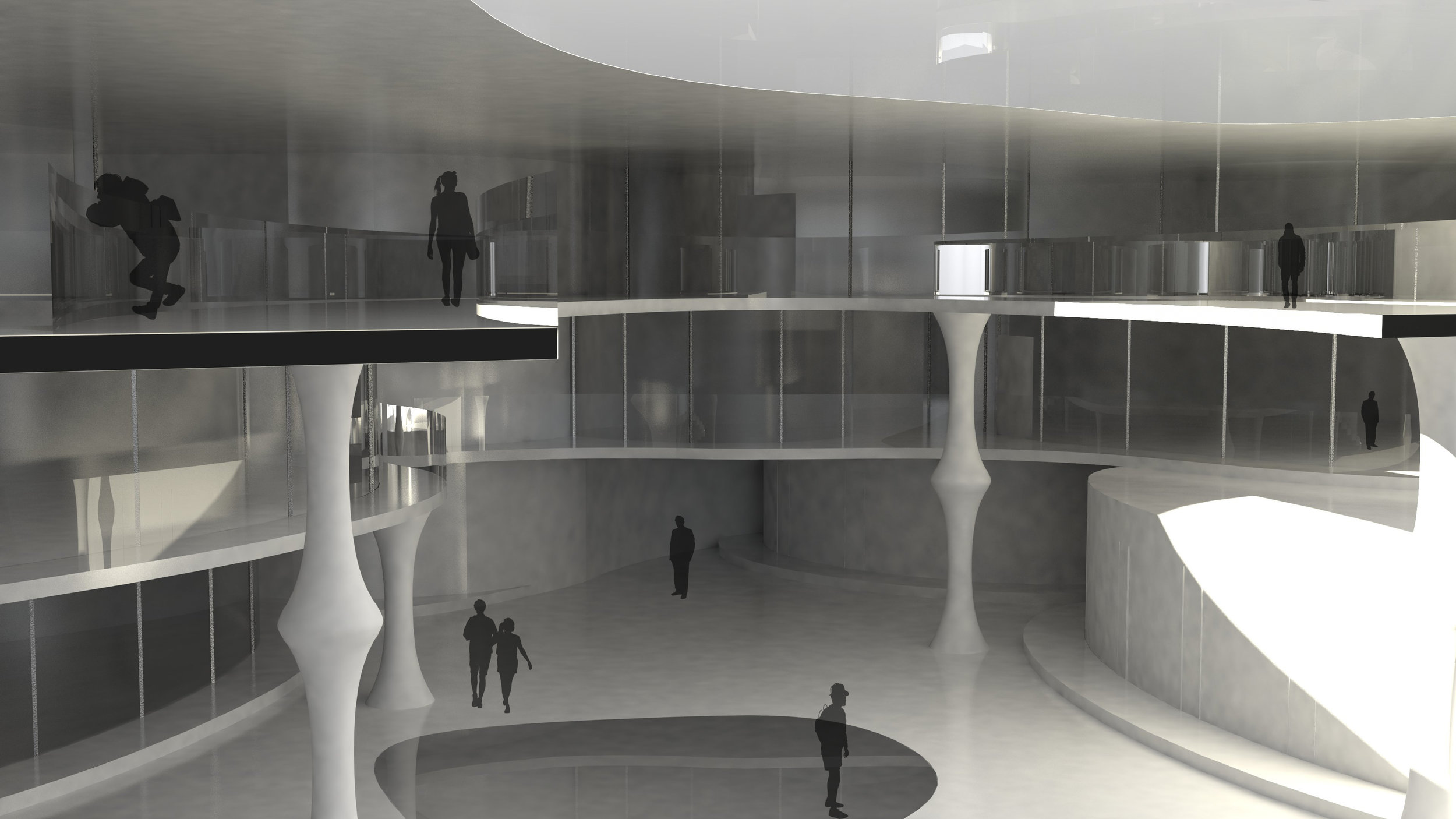 The organization is an exercise in travel from the landscape into the void, or vice a versa. Starting from top to bottom, the centre attempts to provide an excursion through which the occupant happens to experience different programs.